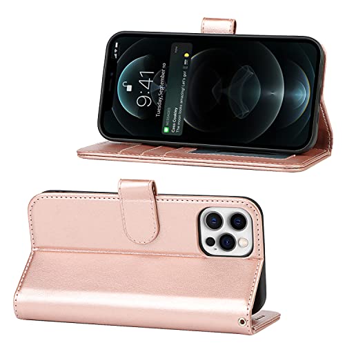 Copmob Cover iPhone 12/12 PRO con Cordino,Flip Portafoglio Custodia in Pelle,[4 Slots][Supporto Stand][Magnetica],Custodia Cover Libro con Laccio per iPhone 12/12 PRO - Oro Rosa