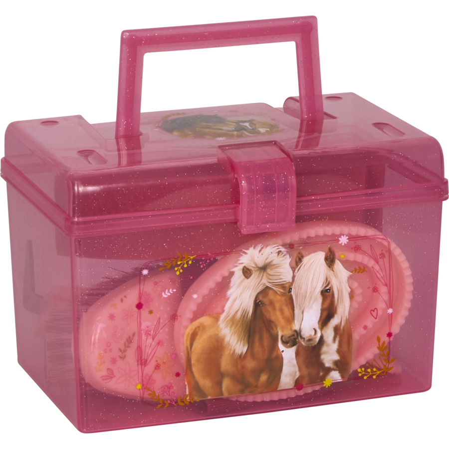 Bellissimo kit per la toelettatura dei cavalli in cinque pezzi in un pratico contenitore. Adatto sia per cavalli di peluche che per cavalli veri. Sono inclusi un raschietto per gli zoccoli, un pettine per la criniera, un pettine per il curry, una spazzola per la toelettatura e una spugna. Con finitura glitterata. dettagli del prodotto: Dimensioni dell'imballaggio (lunghezza x larghezza x altezza): 27 x 6 x 30 cm Materiale: plastica Età: a partire da 3 anni Attenzione Non adatto a bambini di età inferiore ai tre anni. Rischio di soffocamento dovuto a piccole parti che possono essere ingerite.