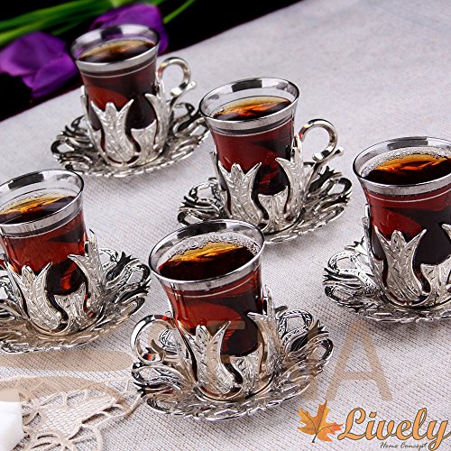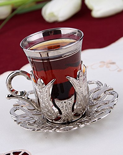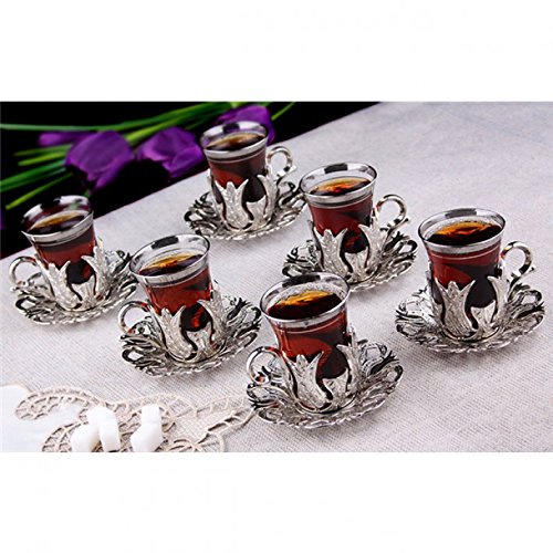 CopperBull 2018 - Set di 6 bicchieri da tè turchi con piattini e cucchiai, colore: Argento