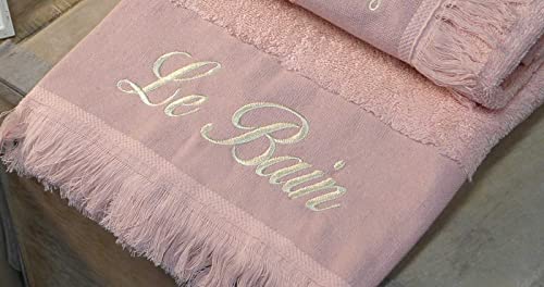 Coppia di Asciugamani Shabby Chic Ricamati con Frange, Set Asciugamani con Ricamo Le Bain (Rosa Cipria)