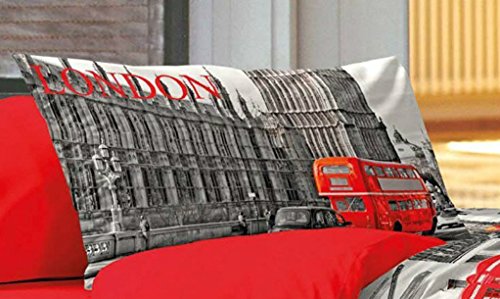 Coppia di Federe Londra (da un lato disegno Bus Rosso come foto dall'altro lato tinta unita Rosso) - in Cotone Italiano - Prodotto di qualità Federa Offerta Promozione