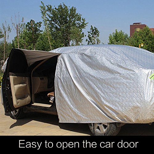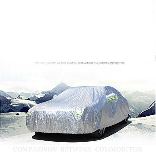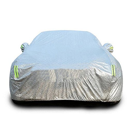 Questa copertura per avere la possibilità di legare ogni angolo per una delle ruote.Non preoccupatevi di il alla fine il copriauto sul pavimento mentre siete via o di vento. Orlo elasticizzato sul fondo per misura la vostra auto e facile installazione.