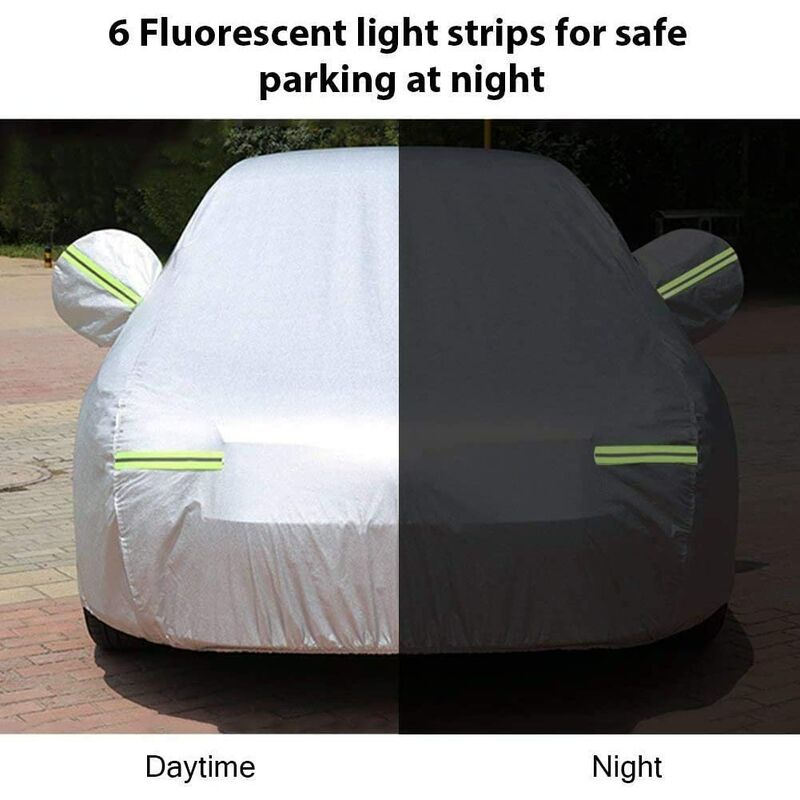 PROTEZIONE PER TUTTE LE INTEMPERIE - Adatto a tutte le stagioni e a tutte le condizioni atmosferiche. Sailnovo Car Cover garantisce alle tue auto la protezione di qualità di cui hanno bisogno contro sporco, sporcizia, graffi, escrementi di uccelli, raggi UV, neve, gelo e altro ancora. Adatto per uso interno ed esterno. 【ANTIVENTO E RIFLETTENTE】 Le cinghie anteriori e posteriori nella parte inferiore impediscono che la copertura venga spazzata via dal vento, rendendola un'ottima scelta per il tempo tempestoso. Questa copertura è inoltre dotata di lunghe strisce riflettenti per garantire che il tuo veicolo sia chiaramente visibile di notte e per evitare urti accidentali. 【MATERIALE ECCELLENTE】 Con una protezione in tessuto multistrato, Sailnovo Car Cover offre un'eccellente difesa per il tuo veicolo. Il rivestimento in alluminio sulla copertura impedisce ai dannosi raggi UV del sole di entrare nella tua auto, mentre un ulteriore interno in morbido cotone protegge la vernice