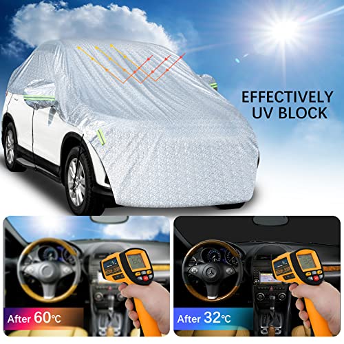 【Materiale Premium】 Questa copertura per auto è composta da un foglio di alluminio PEVA esterno, ovatta interna PP e morbido tessuto non tessuto. Il materiale 100% impermeabile può essere anti-uv, antipioggia e antineve, mantiene l'auto fresca in estate. Il cotone idrofilo PP può proteggere la vernice e il vetro per ridurre l'attrito, con una migliore resistenza all'abrasione e allo strappo