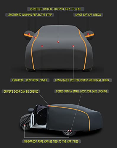 【Copriauto di ottima qualità】Telone per auto realizzato in tessuto oxford di poliestere a doppia cucitura e resistente all'acqua, non facile da rompere e deformare. Questa leggera copertura per auto ha un design con cerniera della porta, orlo elastico per una vestibilità comoda, fissa le cinghie sul volante, può rendere la tua auto più sicura nelle giornate ventose e la copertura viene fornita con una custod