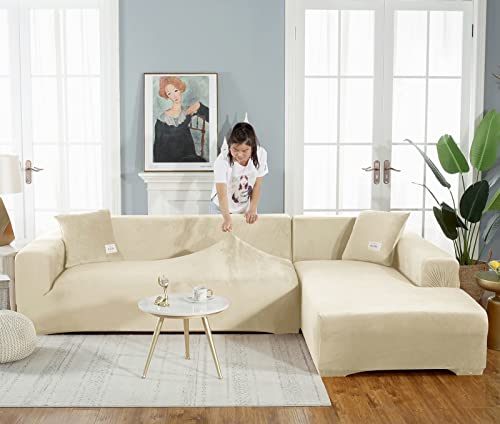JHLD Copridivano con Penisola, Copridivano Elasticizzato Velluto Fodera per Divano A Forma di L. Morbido Antiscivolo Divano Protector Slipcovers per Divano Angolare-Beige-2 posti+4 posti