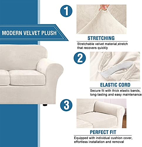 Copridivano In Velluto Di Lusso 4-pezzi Con Fodere Per Cuscini Separate, Fodera Per Divano Antiscivolo In Peluche Ultra Morbido Ad Alta Elasticità Con Fondo Elastico (Avorio,1 posto (80-120 cm))