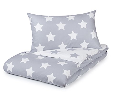 Set copripiumino e federa per letto singolo, grigio argento con stelle bianche