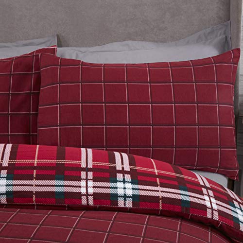 Set copripiumino e federe in flanella, 100% cotone spazzolato, motivo tartan a quadri, colore: rosso, Super King