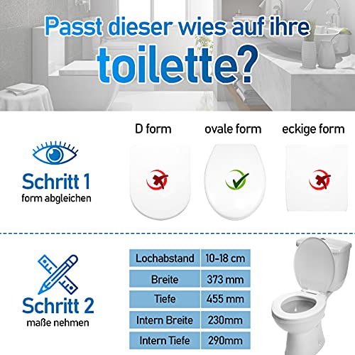 Anello esterno (LxL): circa 45,5 x 38 cm, anello interno (LxL): circa 29 x 23 cm, distanza di installazione: 10-18 cm, adatto per servizi igienici di dimensioni standard.