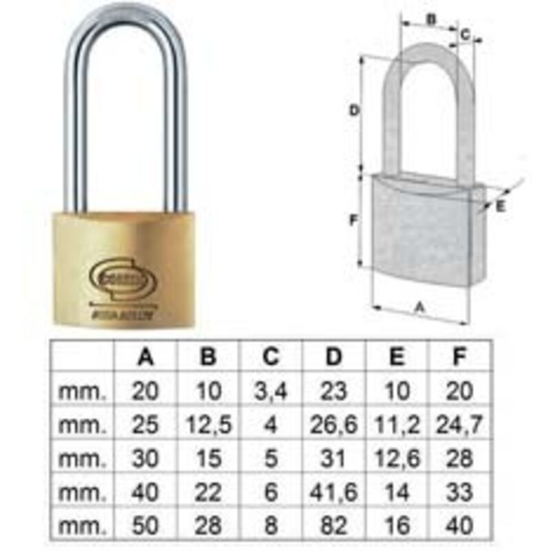 Mm.25 (pl1122500011000) corpo monoblocco in ottone satinato, arco in acciaio carbonitrurato, doppio scrocco da lucchetti > mm.30, spina antigrimaldello per lucchetti > mm.30, dotazione 2 chiavi Categoria merceologica: Lucchetti e accessori - Sicurezza - Lucchetti ad arco
