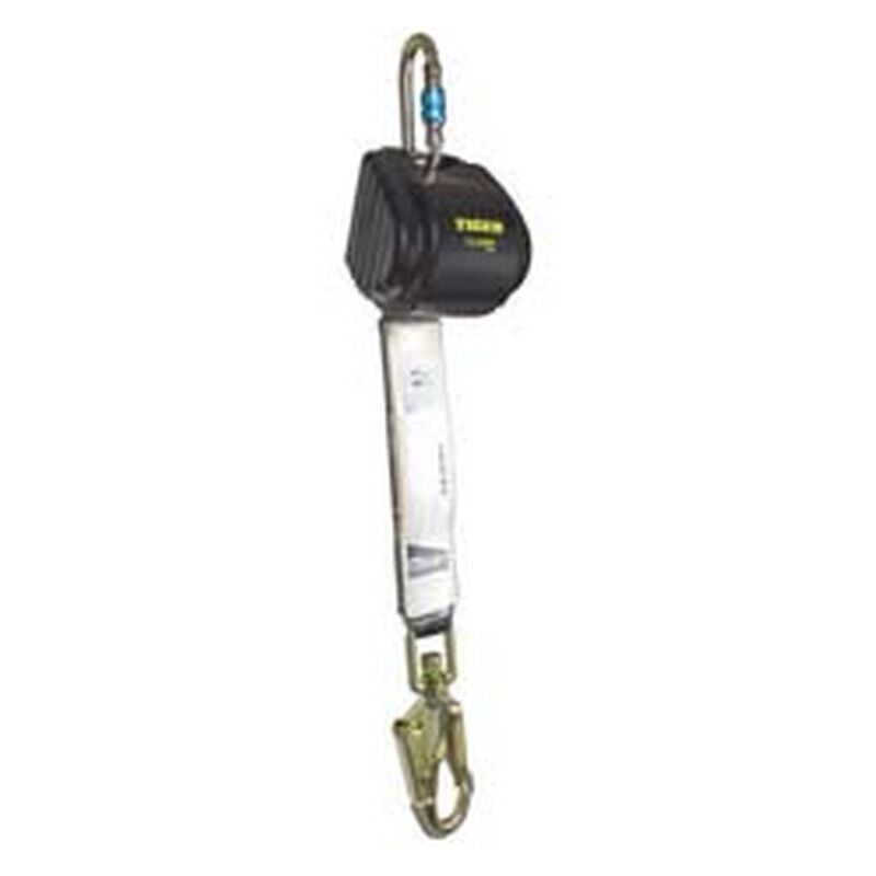 Dispositivo anticaduta retrattile con sistema di recupero antumatico con cinghia in poliestere dallo spessore di mm.50 - include un assorbitore di energia, un moschettone in acciaio con chiusura filettata nella parte superiore sekuralt 981 e un moschett