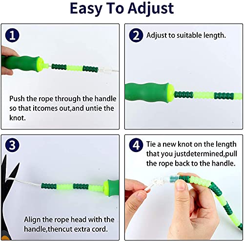 Lunghezza regolabile: la lunghezza totale della corda è di circa 9,1 piedi e può essere regolato alla lunghezza desiderata. Il manico si trova un nodo. Basta far scorrere la corda dal manico, tagliare la corda e stringere il nuovo nodo per regolare la lunghezza della corda.