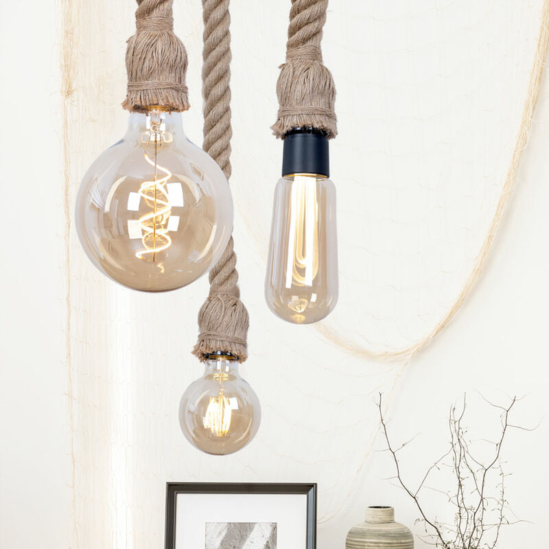 Descrizione Lampada a sospensione in corda di canapa per il soggiorno. Questa lampada è una vera attrazione. Questa lampada si distingue particolarmente bene sopra il tavolo del soggiorno o della sala da pranzo. Questa lampada a sospensione dal design in corda attira anche l'attenzione sopra i banconi o nella sala delle feste. Una lampada con attacco E27 e un massimo potenza di 60 watt può essere inserita nell'apparecchio per illuminare l'area selezionata. La sorgente luminosa non è inclusa nella fornitura. La fornitura include 3 lampade a sospensione! Dettagli lampada • Tipo di prodotto: lampada a sospensione in corda di canapa • Materiale base: metallo, nero • Colore corda canapa: marrone • Grado di protezione: IP20• corda senza nodi (può essere creata a piacere) • materiale di fissaggio incluso (2x tasselli, 2x viti) • diametro base in cm: 10 • Lunghezza totale pendolo in cm: 150 • zoccolo: 1x E27 • sorgente luminosa inclusa: no • sorgente luminosa di alimentazione: 1x max