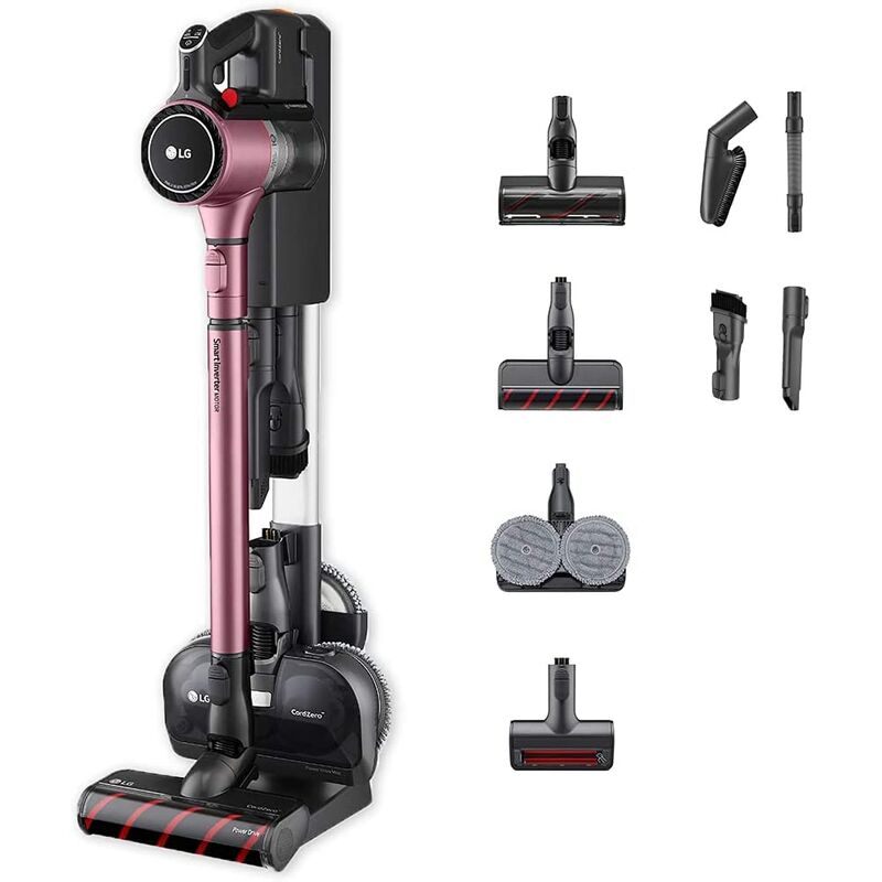 LG CordZero A9K-ULTRA1P Aspirapolvere Senza Fili Potente 200W, Autonomia 120 Minuti, con Wi-Fi, 4 Spazzole e 4 Accessori, Tubo Telescopico, 2 Batterie Ricaricabili. • Aspirazione Potente: il Motore Smart Inverter, garantito 10 anni, combinato alla tecnologia Axial Turbo Cyclone che separa le particelle di polvere e sporco, garantisce un flusso d'aria regolare per una massima potenza di aspirazione. • Spazzole e Accessori: include 4 spazzole (Multi-Superficie, Power Drive Mini Nozzle, Spazzola Slim e Power Drive Mop) e 4 accessori (Crevice, Combination, Multi-Angolo e Tubo flessibile) per pulire in profondità polvere e sporco da ogni superficie e tessuto (compresi tappeti e pavimenti duri), lavare e aspirare allo stesso tempo, raggiungere anche le aree più difficili come angoli, fessure, lampadari e ripiani, ed eliminare i peli di animali. • Pulisci e Ricarica Insieme: CordZero è dotato di due batterie ricaricabili e intercambiabili che garantiscono fino a 120 min di pulizie no stop.