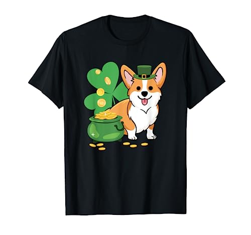 Un simpatico cartone animato Pembroke Welsh Corgi cane per il giorno di San Patrizio - con una pentola di grassetto, shamrocks, e cappello Leprechaun