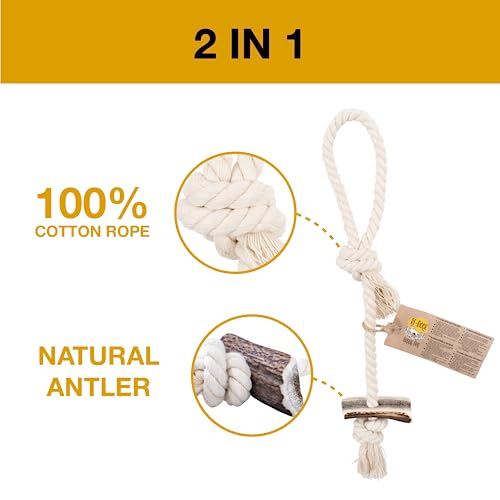 SICUREZZA - Le corna di cervo non non si scheggiano. La corda è fatta a mano in cotone, senza sostanze coloranti o conservanti.