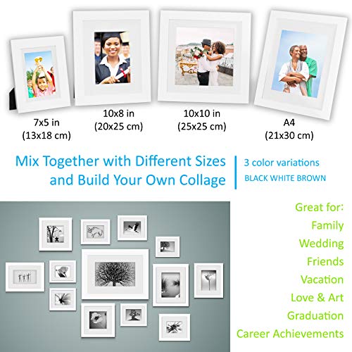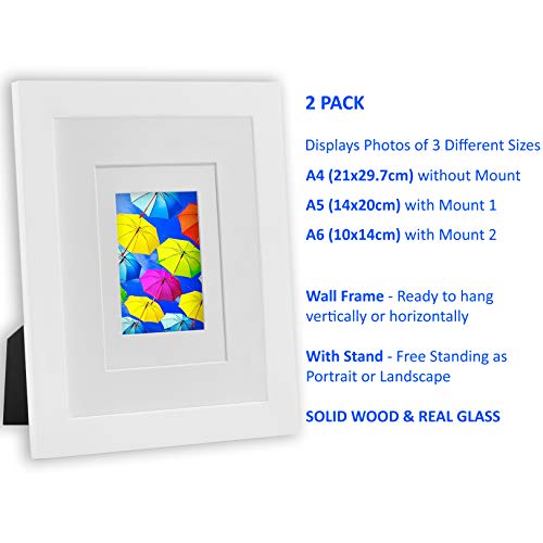 Cornice A4 Bianca (Set di 2) - Solido Legno, Vetro Anteriore - Cornici per Foto A4 (20 x 30 cm) con Passepartout per Foto A5 (15 × 20 cm) e A6 (10 x 15 cm) - Portafoto da Tavolo e da Parete