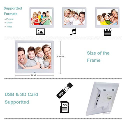 Punto di taglio versatile: Cornice digitale con slot per cuffie USB, SD e 3,5 mm. Il dispositivo supporta unità USB e schede SD fino a 32 GB supportano più formati di file. Viene fornito con un telecomando intuitivo.