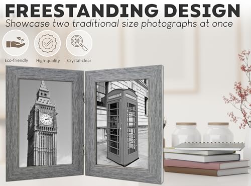 COSTRUZIONE DUREVOLE: Il nostro doppio portafoto è rinforzato con una staffa doppia cerniera argentata per una durata maggiore, mentre la cornice con effetto legno aggiunge un tocco di classica raffinatezza a qualsiasi ambiente.