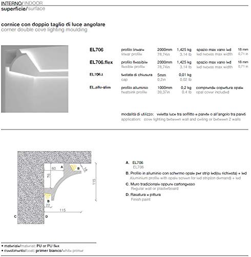 Cornice per illuminazione indiretta led doppia a parete e soffitto - EL706 (2 metri)