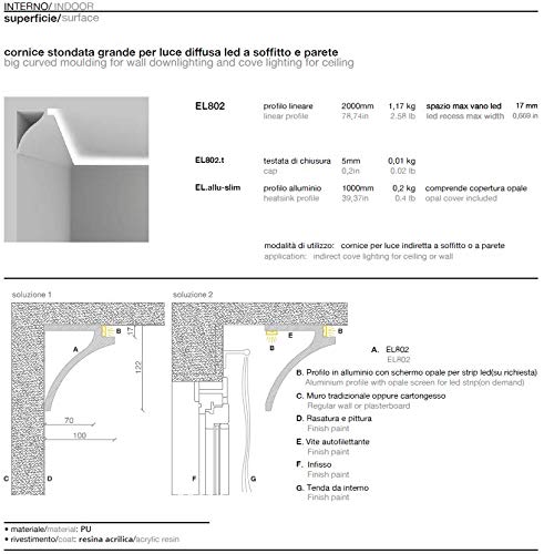 Cornice per illuminazione indiretta led a soffitto e parete o tenda - EL802 (2 metri) ...