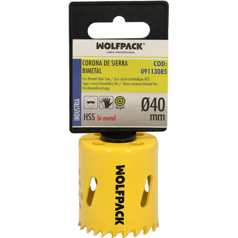 Corona bimetallica Target Saw - Dimensioni: Ø 40 mm. - Realizzata in una lega con elevata durezza e resistenza all'usura. - Denti temprati termicamente, che gli conferiscono un'elevata stabilità ai taglienti. - Base della corona rinforzata. - Fori laterali per l'evacuazione del truciolo e un migliore raffreddamento. - Ideale per realizzare fori su acciaio dolce, ghisa, ottone, alluminio e legno. - Articolo noto come trapano per legno, trapano per legno, sega per legno, sega per legno.