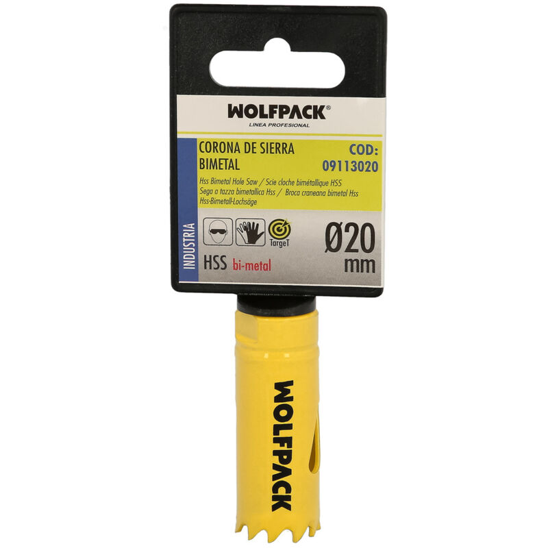 Corona bimetallica Target Saw - Dimensioni: Ø 20 mm. - Realizzata in una lega con elevata durezza e resistenza all'usura. - Denti temprati termicamente, che gli conferiscono un'elevata stabilità ai taglienti. - Base della corona rinforzata. - Fori laterali per l'evacuazione del truciolo e un migliore raffreddamento. - Ideale per realizzare fori su acciaio dolce, ghisa, ottone, alluminio e legno. - Articolo noto come trapano per legno, trapano per legno, sega per legno, sega per legno.