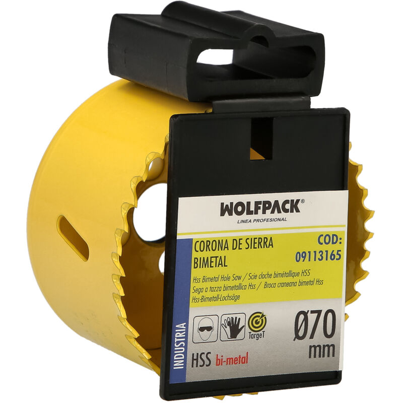 Corona bimetallica Target Saw - Misura: Ø 70 mm. - Realizzata in una lega altamente dura e resistente all'usura. - Denti temprati termicamente, che gli conferiscono un'elevata stabilità ai taglienti. - Base della corona rinforzata. - Fori laterali per l'evacuazione del truciolo e un migliore raffreddamento. - Ideale per realizzare fori su acciaio dolce, ghisa, ottone, alluminio e legno. - Articolo noto come trapano per legno, trapano per legno, sega per legno, sega per legno.