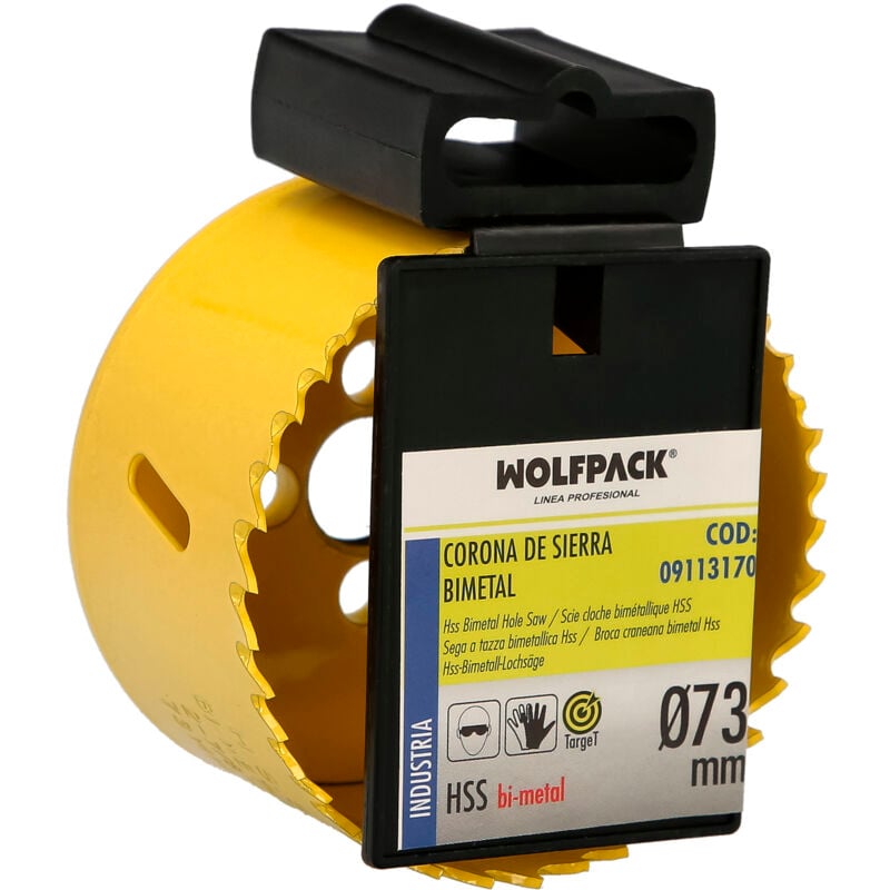 Corona bimetallica Target Saw - Misura: Ø 73 mm. - Realizzata in una lega di elevata durezza e resistenza all'usura. - Denti temprati termicamente, che gli conferiscono un'elevata stabilità ai taglienti. - Base della corona rinforzata. - Fori laterali per l'evacuazione del truciolo e un migliore raffreddamento. - Ideale per realizzare fori su acciaio dolce, ghisa, ottone, alluminio e legno. - Articolo noto come trapano per legno, trapano per legno, sega per legno, sega per legno.