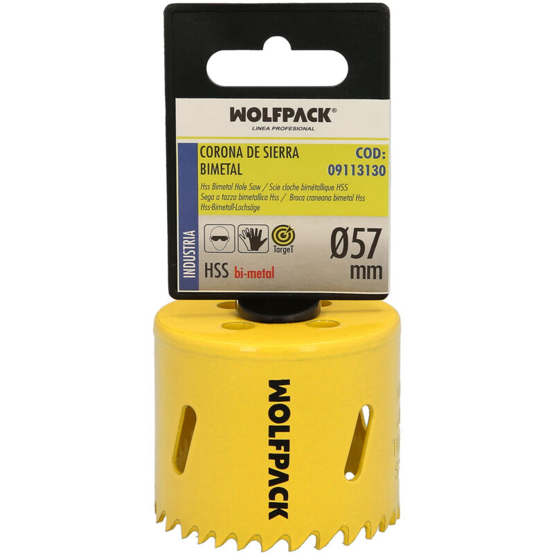 Corona bimetallica Target Saw - Misura: Ø 57 mm. - Realizzata in una lega con elevata durezza e resistenza all'usura. - Denti temprati termicamente, che gli conferiscono un'elevata stabilità ai taglienti. - Base della corona rinforzata. - Fori laterali per l'evacuazione del truciolo e un migliore raffreddamento. - Ideale per realizzare fori su acciaio dolce, ghisa, ottone, alluminio e legno. - Articolo noto come trapano per legno, trapano per legno, sega per legno, sega per legno.