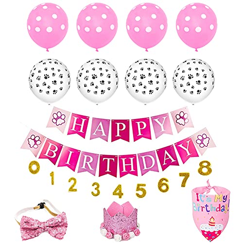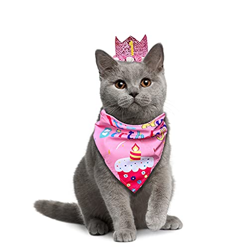 Corona di fiori rosa Cappello per compleanno del gatti e cani,Set di decorazioni per palloncini,sciarpa triangolo,papillon, feste striscioni di compleanno cane e gatto per animali domestici