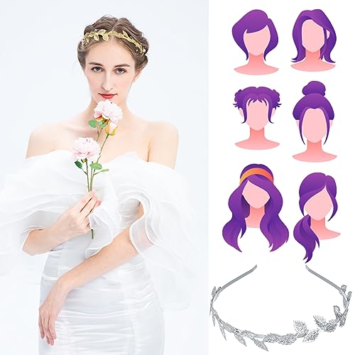 Corona Dea Tiara Romana, 2 Pezzi Cerchietto per Capelli con Foglie di Alloro, Diadema Fascia Della Foglia Corona Accessori, per Capelli da Sposa Copricapo Donna - Oro Argento