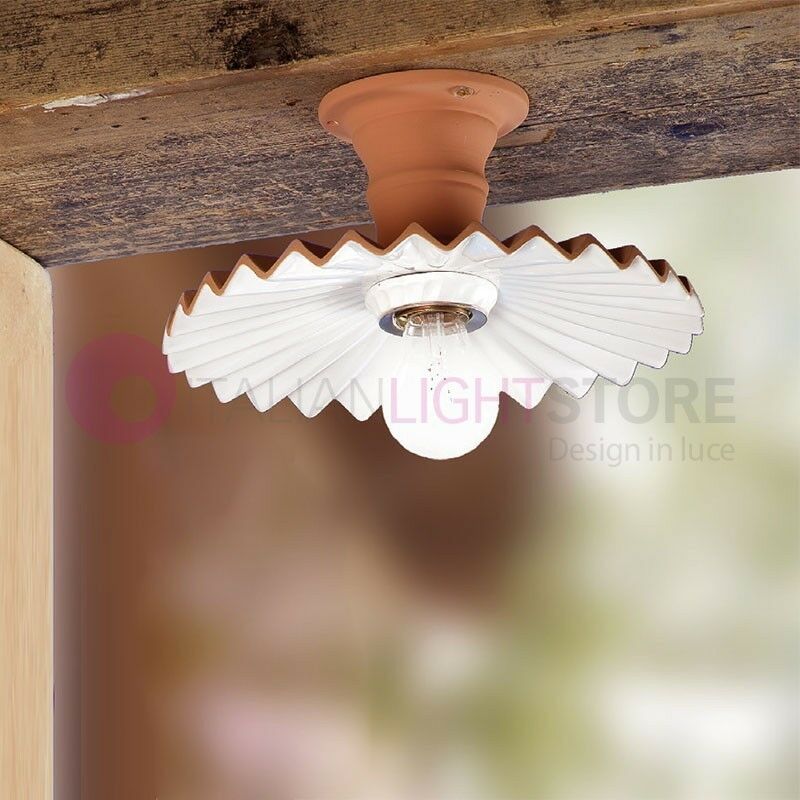 Lampada da soffitto in ceramica terracotta, in stile rustico country. Lampada da soffitto plafoniera realizzata in ceramica terracotta, in stile classico rustico country, collezione Cortona di Ceramiche Borso . La lampada ha elementi in ceramica terracotta lavorata a mano. E' composta da una base a soffitto (d.11 cm) e da un particolare diffusore di forma ondulata plissettata (d.28 cm), con la parte inferiore smaltata bianca. La collezione di lampadari in ceramica Cortona è ispirata al passato e ripropone materiali classici come ceramica, ferro e ottone, sapientemente lavorati da artigiani secondo antiche tradizioni.Comprende il saliscendi, le lampade a sospensione (2 misure), le appliques a parete (VEDI CORRELATI). Produzione 100% Made in Italy. Dimensioni: piatto d. 28 cm, base a muro d. 11 cm. Elettrificazione: 1 x E27 max 100W Lampadina non fornita (possono essere utilizzate lampadine a basso consumo o led). Per interni.
