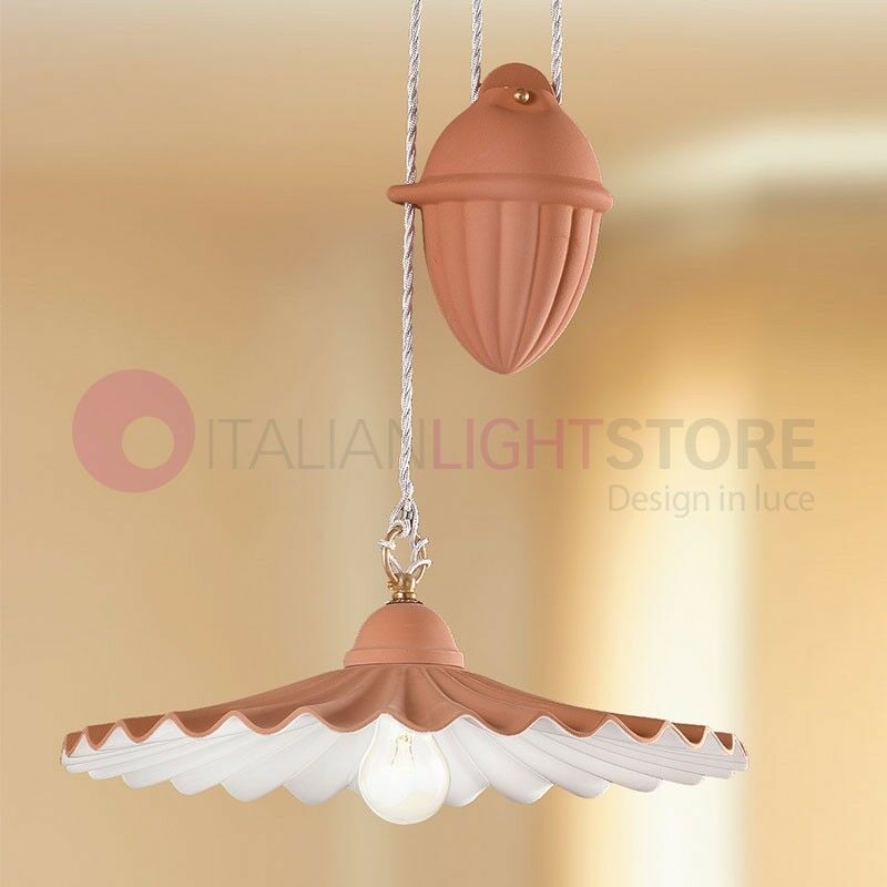 Lampada a sospesione con saliscendi in ceramica terracotta con diffusore ondulato d.43. Lampadario a sospensione con saliscendi in ceramica terracotta, ideale per l'illuminazione della cucina o del tavolo da pranzo, collezione Cortona di Ceramiche Borso . La lampada ha elementi in ceramica terracotta lavorata a mano ;
