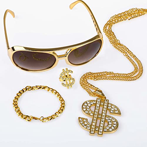 COSAVOROCK Costume da Rapper Hip Hop Anni 80 90 Accessori Kit 4 pezzi Catena in Metallo Oro Collana Bracciale Anelli e Occhiali da Sole