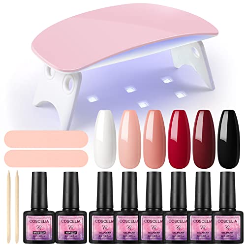 TUTTO IN UNO KIT di COSCELIA: 6 Smalti Semipermanenti Gel (8ml)+Base e Top Coat+Lampada LED+UV 6W+gli Strumenti per Manicure Nail Art.Si può divertirti a fare le unghie a casa con questo kit per unghie senza la preoccupazione di spendere troppo nel salone di bellezza.