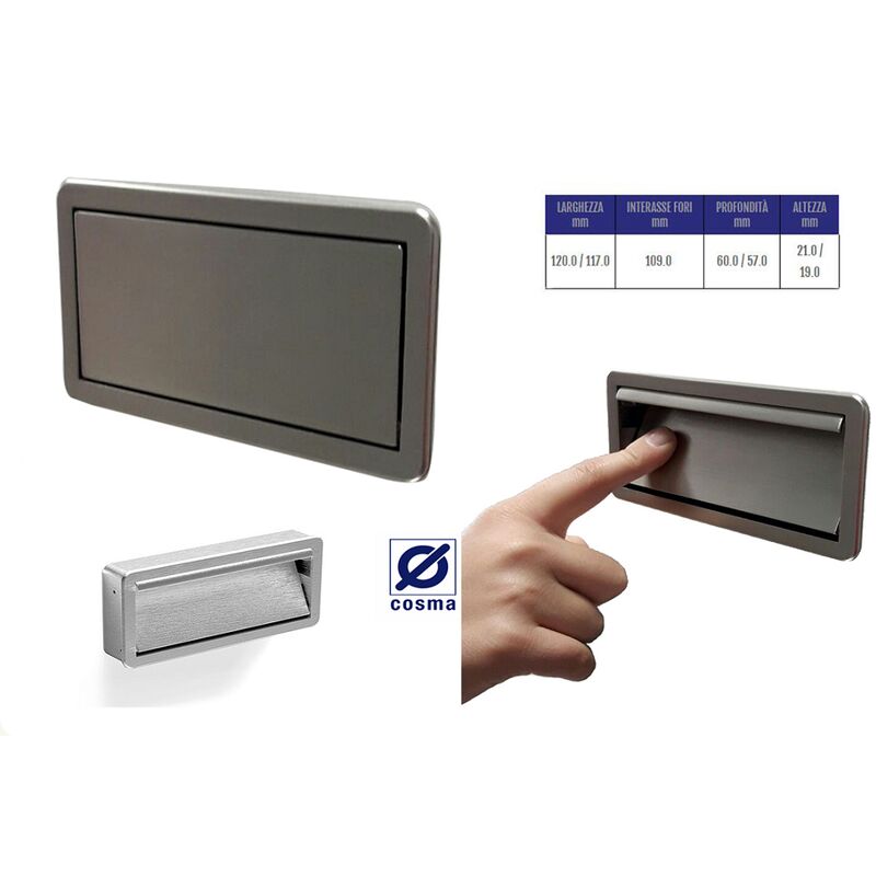 Maniglie da incasso per mobile/porte marca Cosma, Caratteristiche tecniche: -Materiale:Zinkral -Finitura Inox Satinato Brillante -Interasse: mm.109 -Dimensioni esterne della maniglia: mm. 120x60x21 -Misura fresata del foro di mm.117x157x19 La confezione comprende: - 1 Maniglia - Viteria ed accessori per il montaggio Perché scegliere Cosma? COSMA (Citterio Onorato Specialità Maniglie e Affini) nasce nel 1955 nel cuore del distretto manifatturiero della Brianza, dall'iniziativa del suo fondatore Citterio Onorato, specializzandosi nella produzione di articoli per ferramenta. L'azienda si espande rapidamente e, grazie all'impulso della seconda generazione, inizia a progettare e produrre maniglie per il settore dell'arredamento abbracciando la commercializzazione nei mercati esteri. Dal 1990 evolve gradualmente la propria produzione, passando dalla pressofusione dell'ottone alla zama, una lega di zinco più malleabile. Cosma mette a disposizione alta specializzazione e profonda conoscenza