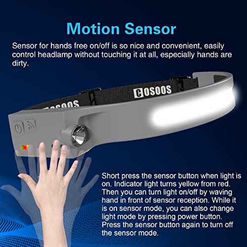 ✔️Modalità Sensore, Luce Vivavoce - La nostra lampada frontale COSOOS grandangolare ha una batteria al litio incorporata da 1202 mAh e può essere caricata tramite il cavo di ricarica USB C incluso e il caricatore da muro. Quando la luce è accesa, puoi premere brevemente il pulsante del sensore e impostarlo come modalità sensore (la spia diventa gialla da rossa).