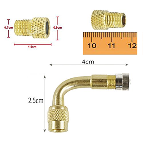 Valvola di estensione a gomito in ottone da 90 gradi, valvola Schrader / valvola americana, fornita con cappuccio e anima, adatta a tutte le autovetture, camion leggeri e pesanti, motocicli e veicoli ricreazionali con valvole standard per pneumatici. L'estensore semplifica il controllo e il gonfiaggio delle gomme doppie e consente di utilizzare una pompa a pedale o un compressore per gonfiare le gomme.