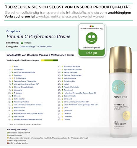 Effetto a lunga durata e immediato: con la crema Cosphera Vitamin-C avrete un prodotto di qualità altamente concentrato. La nostra crema idratante contiene un complesso di principi attivi ad alto dosaggio che idrata la pelle matura e secca e mista, rendendoti più giovane e fresco.