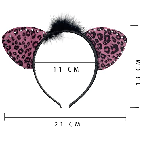 Set di costume per Carnevale Halloween e festa Cosplay Animali, Cerchietto con orecchie Papillon e coda con stampa di animali, per ragazze e donne, 3 pezzi (leopardo rosa)