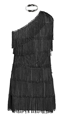 Costume anni 20 da Charleston, firmato Emma's Wardrobe - Include Vestito nero con frange, Fascia, Boa di piume bianche - Costume Charleston per Halloween e Spettacoli - Alta qualità - Taglie EUR 40-42