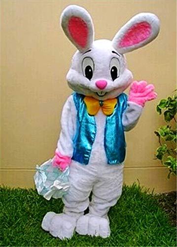 Un pezzo di costume della mascotte del coniglietto di Pasqua include testa, corpo, calette e guanti come si vede nella foto.