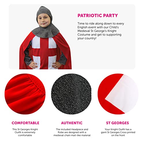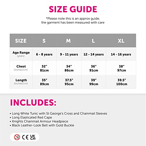 Include: top tunica bianco con maniche rosse in effetto corona e corona di St George, copricapo in stile cinema, mantello rosso e cintura nera in stile leatehr