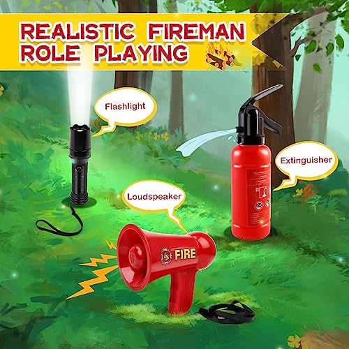 DeAO Costume da Pompiere per Bambini 12 Pezzi,Giocattolo del Vigile del Fuoco con Accessori Realistici,Include Estintore Giocattolo,Torcia Elettrica,Ascia Giocattolo,Regalo per Bambini
