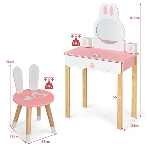 COSTWAY 2-IN-1 Toeletta Trucco Bambina, Set Postazione Trucco con Sgabello e Specchio, Cassetti, 2 Organizzatori, Tavolo da Trucco per Bambini, 3+ Anni (Rosa)
