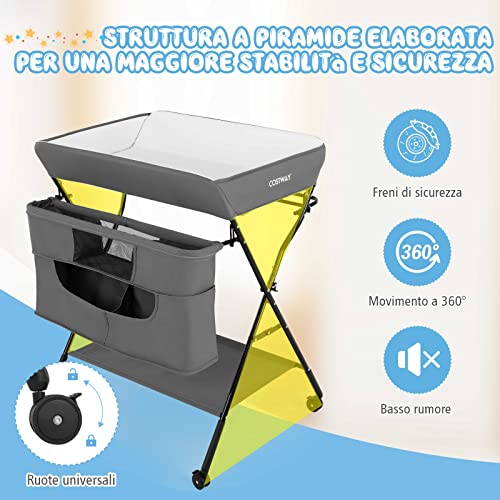 COSTWAY 4-in-1 Fasciatoio Pieghevole con Rotelle, Altezza Regolabile, Fasciatoio Portatile con Portaoggetti Borsa e Ripiano, Fasciatoio Neonato 0-12 Mesi (Grigio)