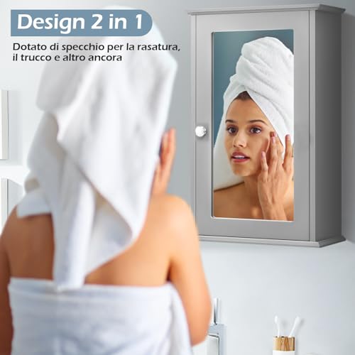 COSTWAY Armadio a Specchio da Bagno a 2 Ripiani, Armadietto Mobiletto per Bagno da Muro, Mensola Regolabile, 34 x 15 x 51cm (Grigio)