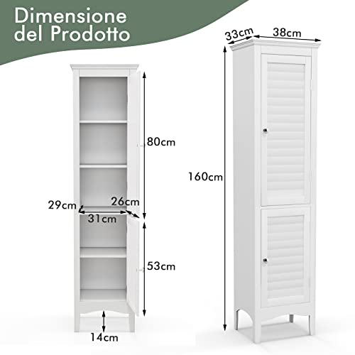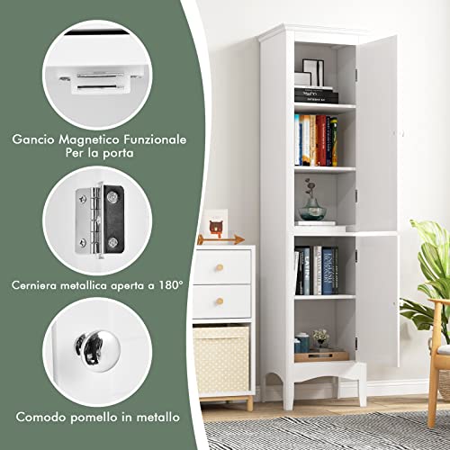 COSTWAY Armadio da Terra Alto, Armadietto da Bagno Stretto con 2 Porte a Scomparsa e 5 Ripiani, Armadio Multifunzionale con Ripiano Regolabile per Bagno Soggiorno Camera da Letto, 38x33x160 cm